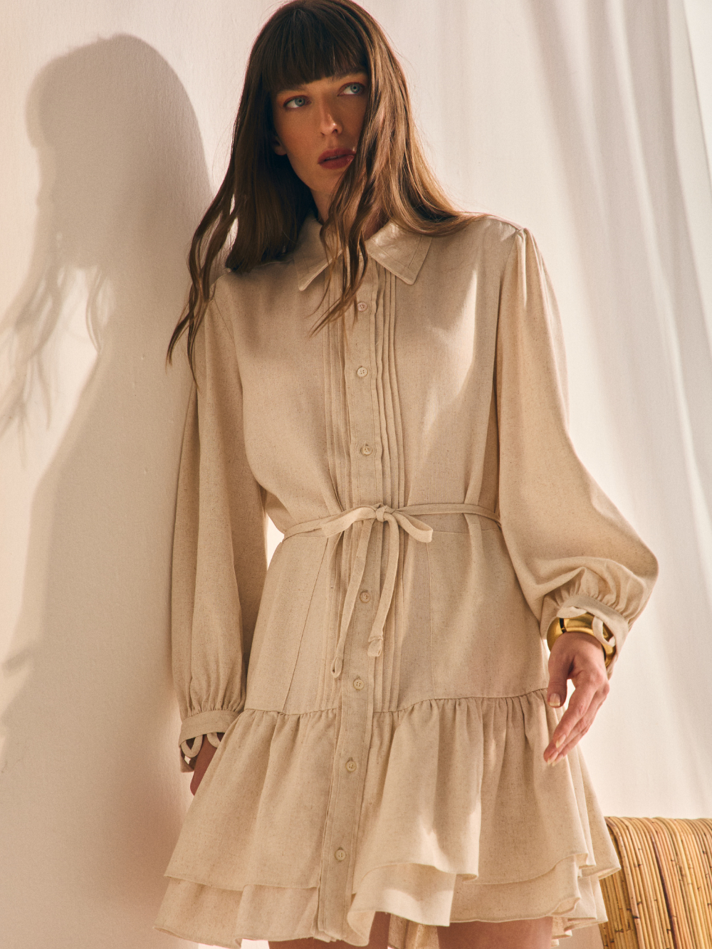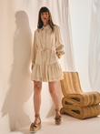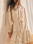 Vestido tipo chemise com leve transparência. Modelagem reta com cintura ajustável por amarração. Possui gola de camisa estruturada, fechamento frontal por botões e detalhe de pregas verticais. Saia com babado duplo e leve volume.