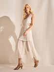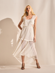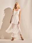 Vestido longo confeccionado em renda de tricot, com modelagem ajustada na parte superior e saia evasê. Apresenta decote profundo em V com tomara que caia reto embutido. Conta com recorte levemente franzido na altura dos quadris.