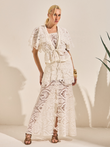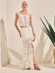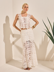 Saia de cintura alta em renda com fenda frontal. Fechamento com zíper. Saia toda com aplicação de barrados feitos manualmente.