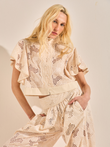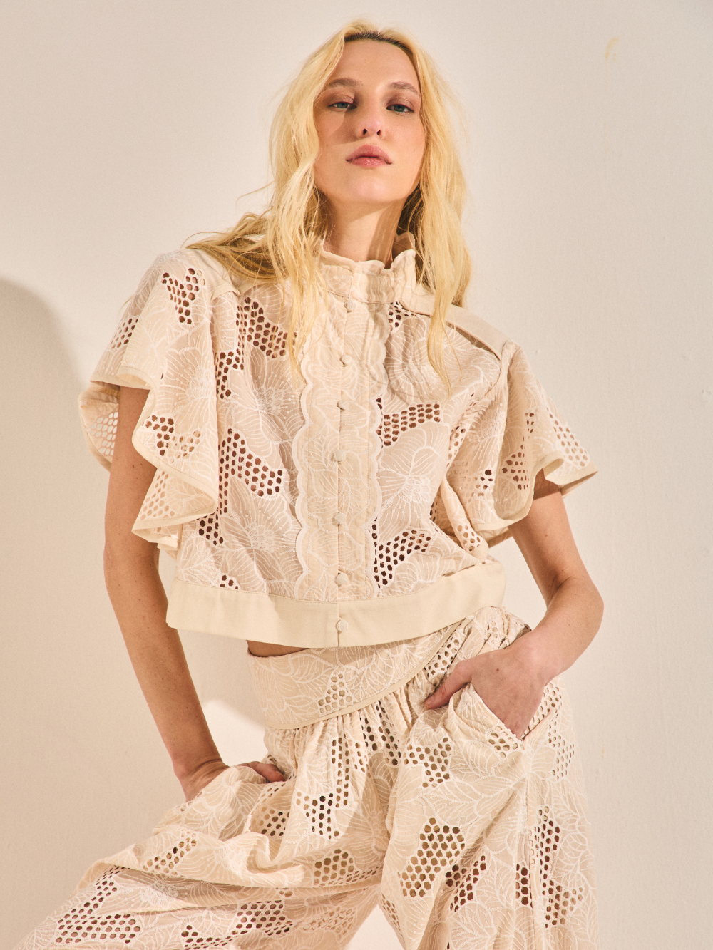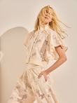 Camisa cropped de algodão bordado com mangas curtas em babado duplo e gola alta com acabamento em vivos bordados