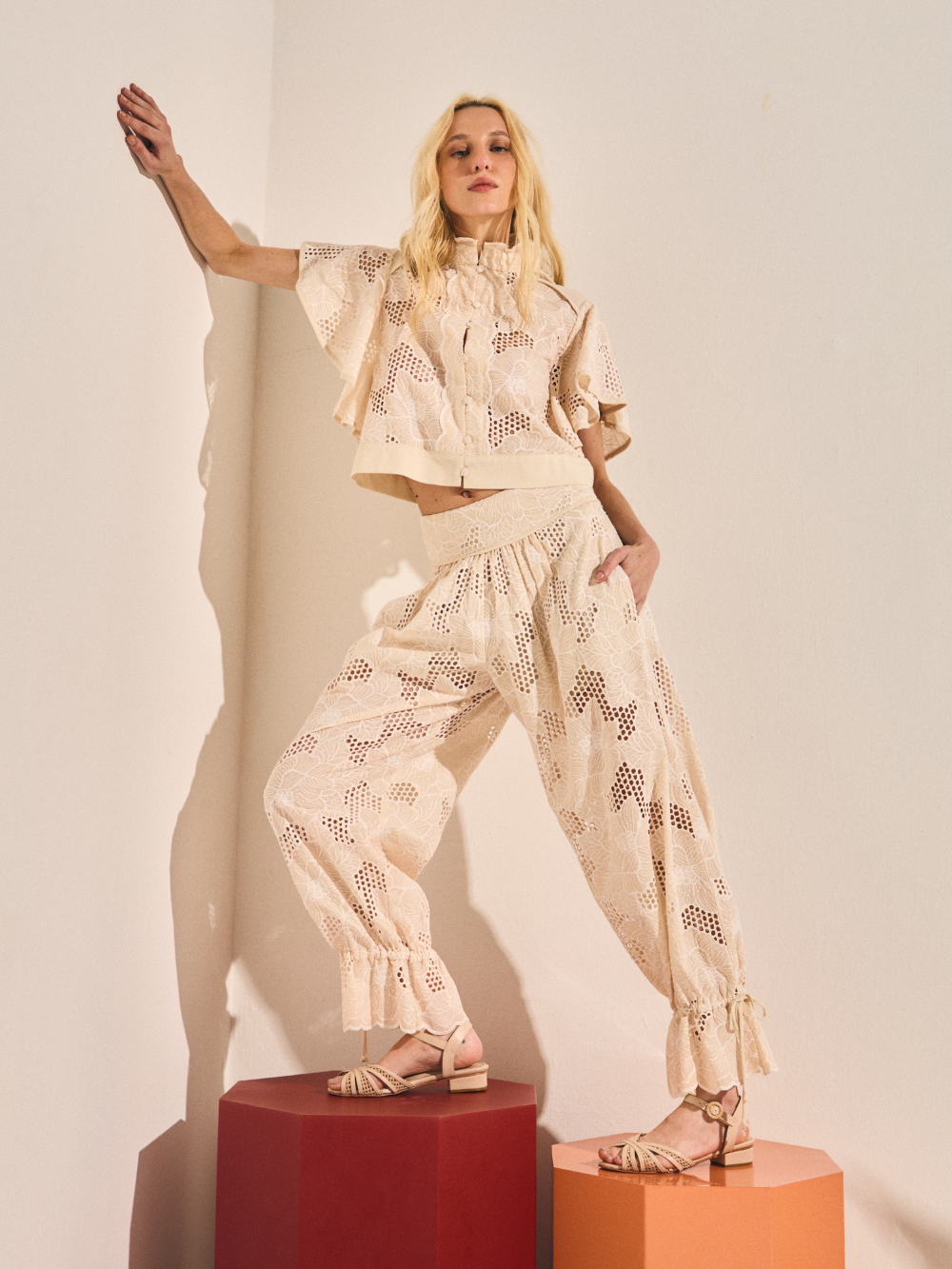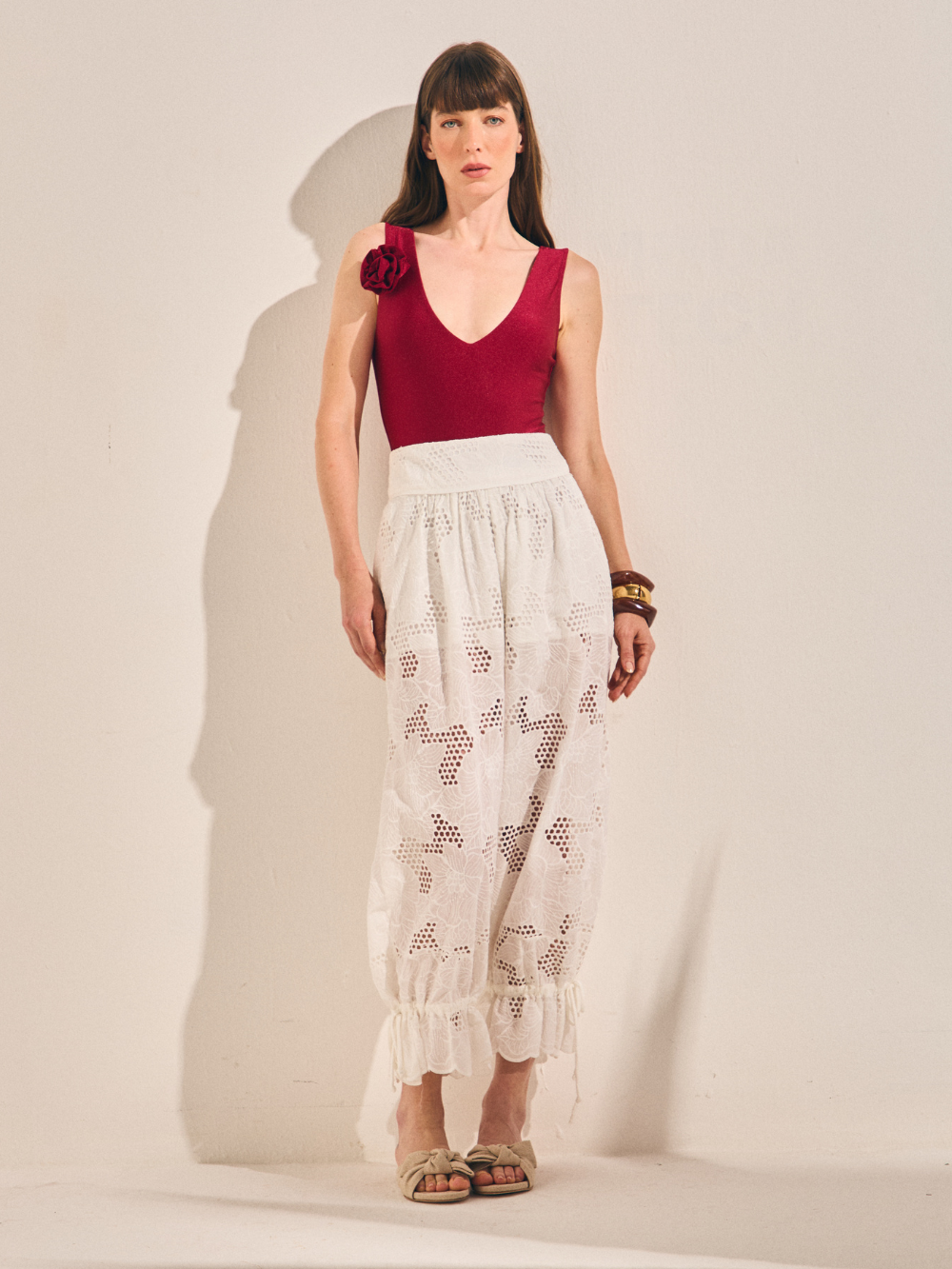 Calça em leve com bordado floral vazado por toda a peça. O modelo possui caimento reto com cos elástico e nas barras.