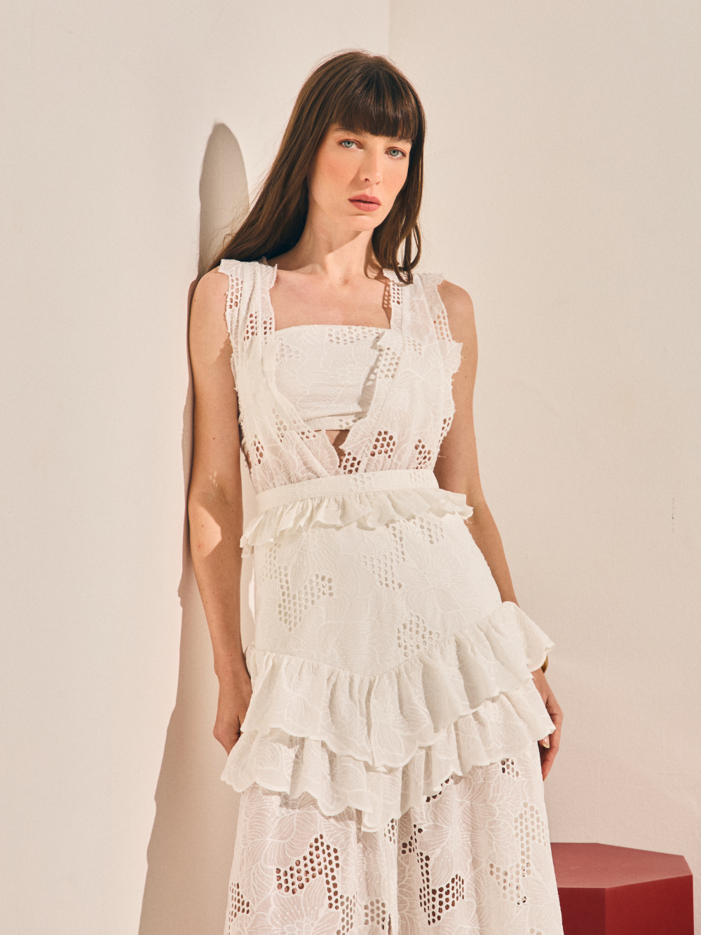 Vestido em tecido rendado, com modelagem ajustada. Possui decote profundo em V com top interno no recorte central. Apresenta duas camadas de babados na região da cintura e fenda frontal.
