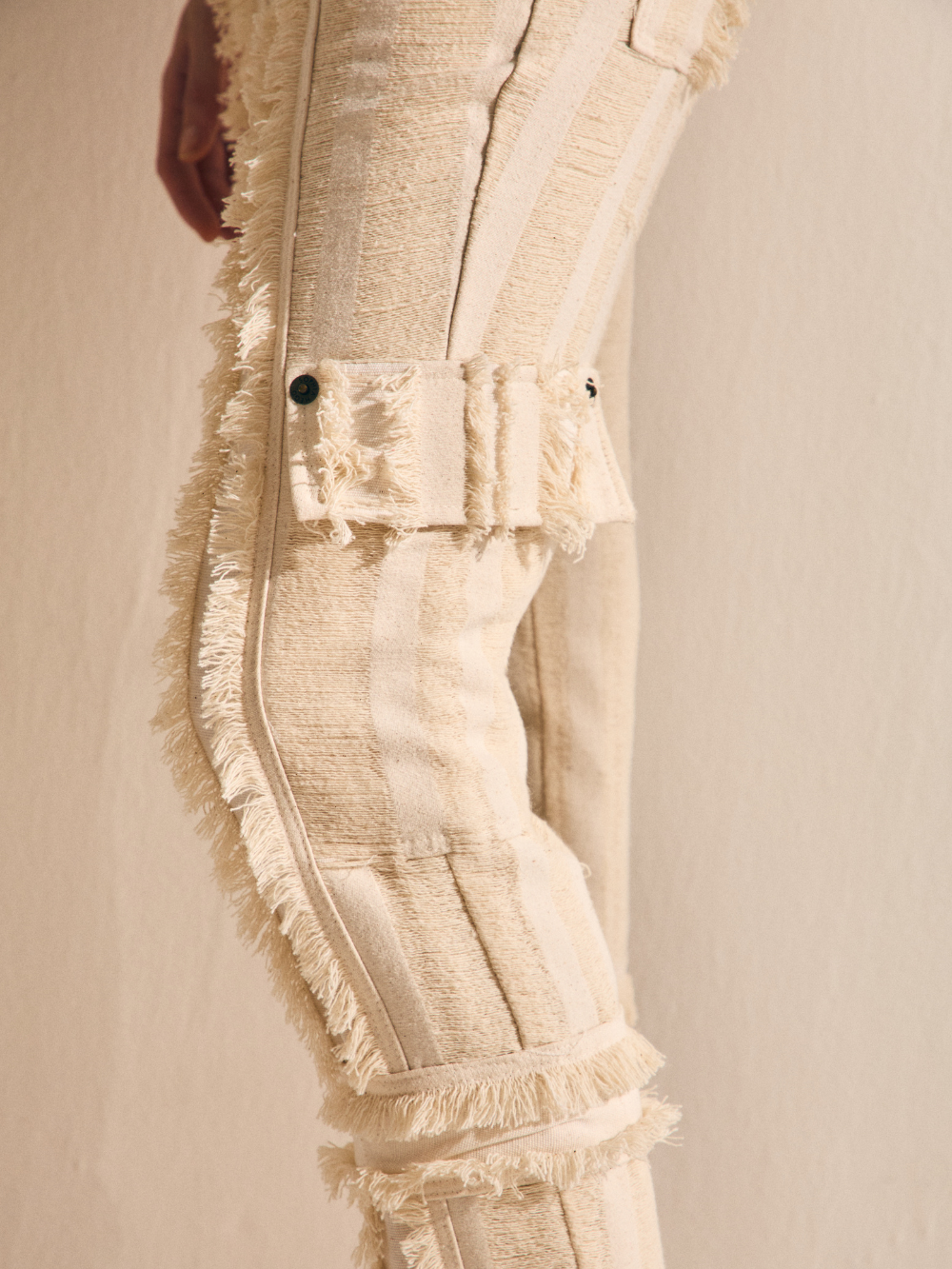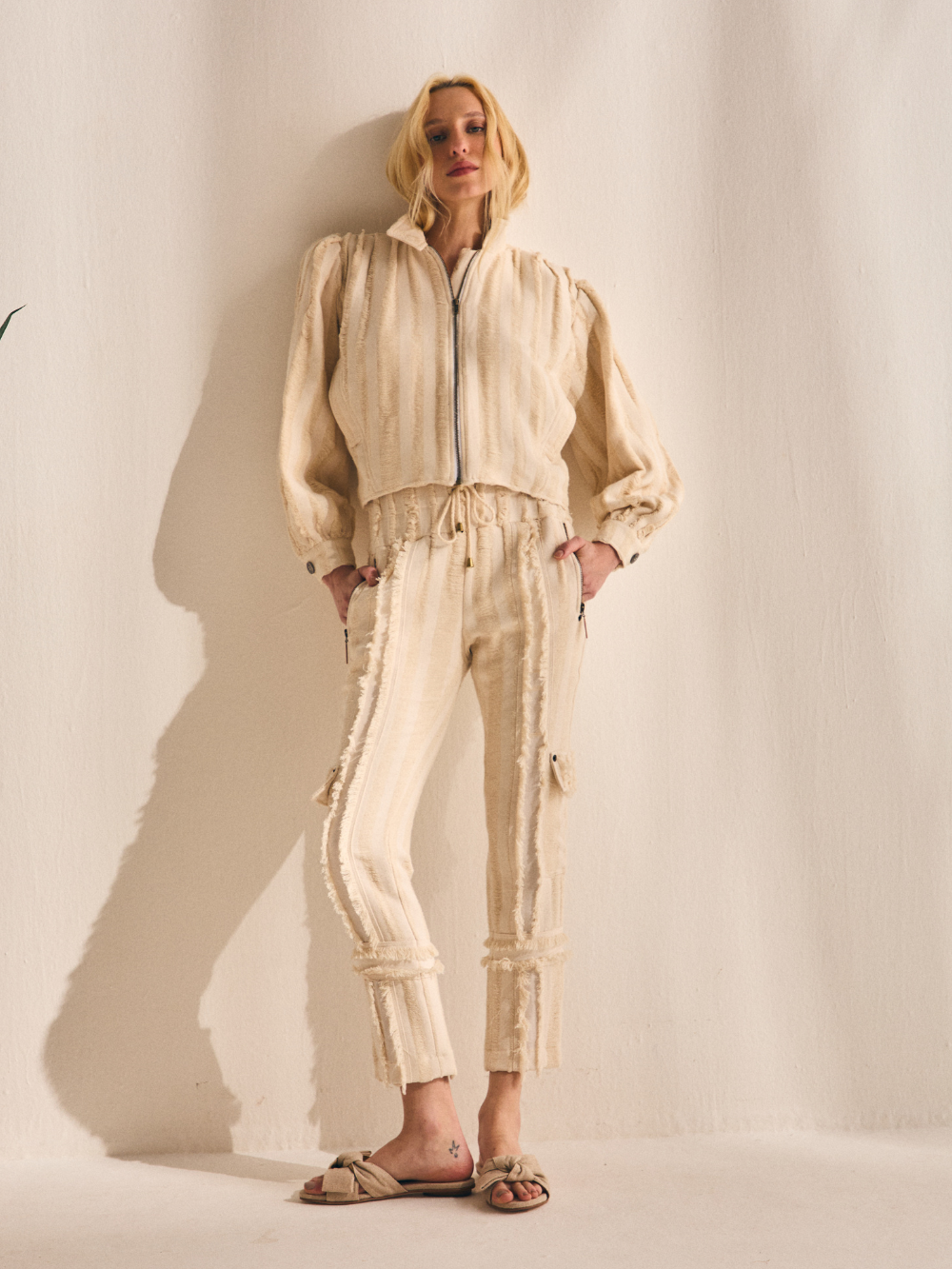 Calça cargo de cintura média com elástico e cordão para ajuste, bolsos utilitários e detalhes com zíper.