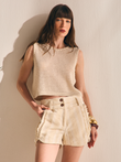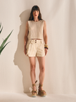 Shorts de cintura alta com zíper e botões frontais, bolsos laterais com zíper e corte reto.