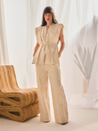 Calça ampla em modelagem wide-leg, em tecido tipo sarja com bordado floral. Possui cintura alta, cós de elástico e detalhe de amarração.